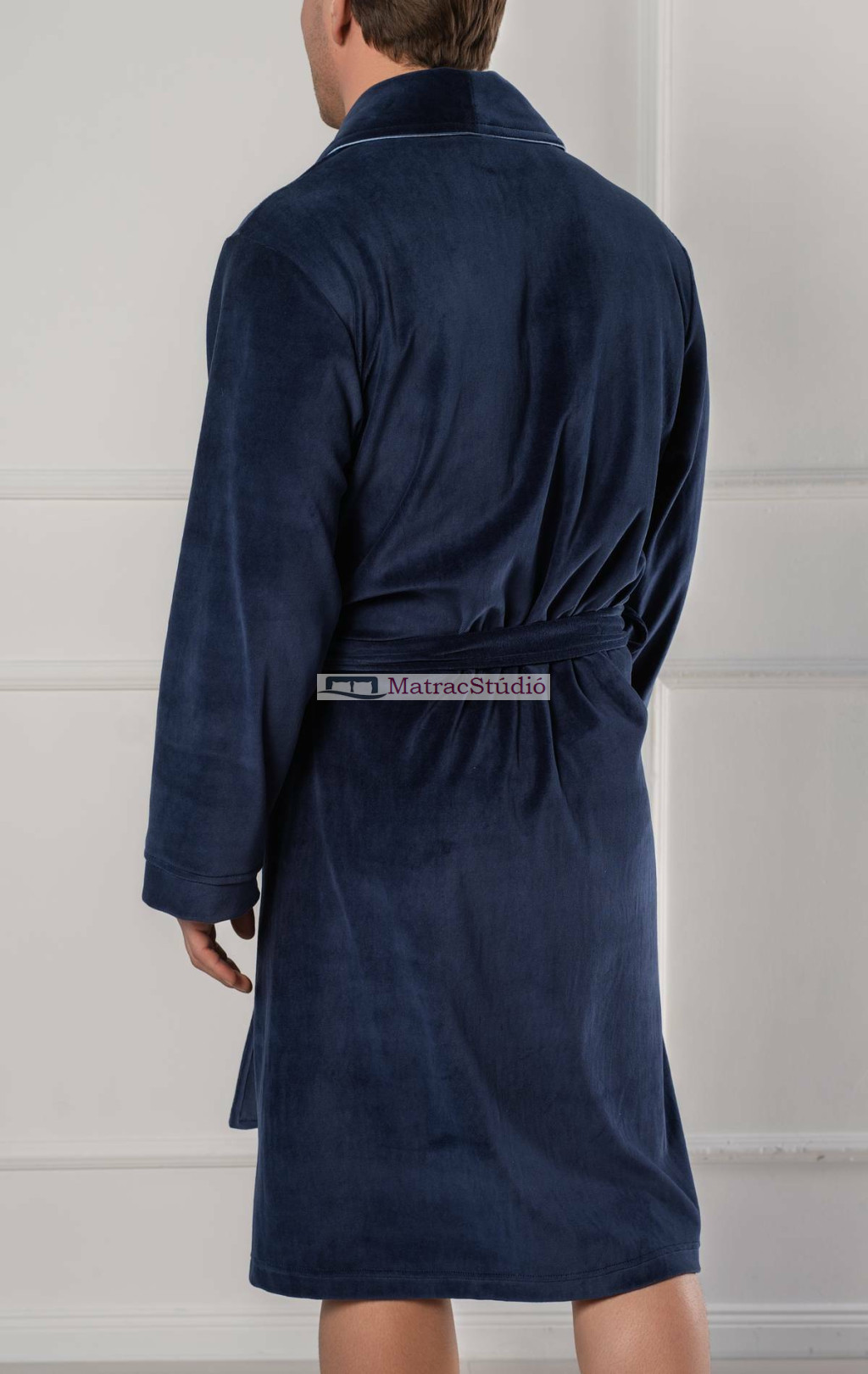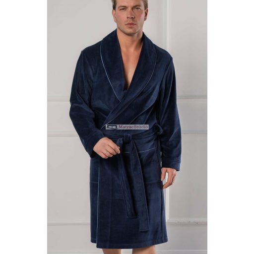 Elegáns férfi fürdőköpeny a prémium kategóriás nemzetközi piacon is elismert hazai gyártótól a Belmanettitől, amely klasszikus pamutkeverékű nicky velúrból készült, puha, mégis határozott megjelenést biztosít. A sálgalléros szabást teljes hosszában szatén paszpólozás díszíti, amely a gallér szélén és a rátett zsebek mentén is végigfut, kifinomult részletet ad. Sötétkék "Dark Blue" színű modell, időtlen darab a klasszikus eleganciát és kényelmet kedvelőknek.