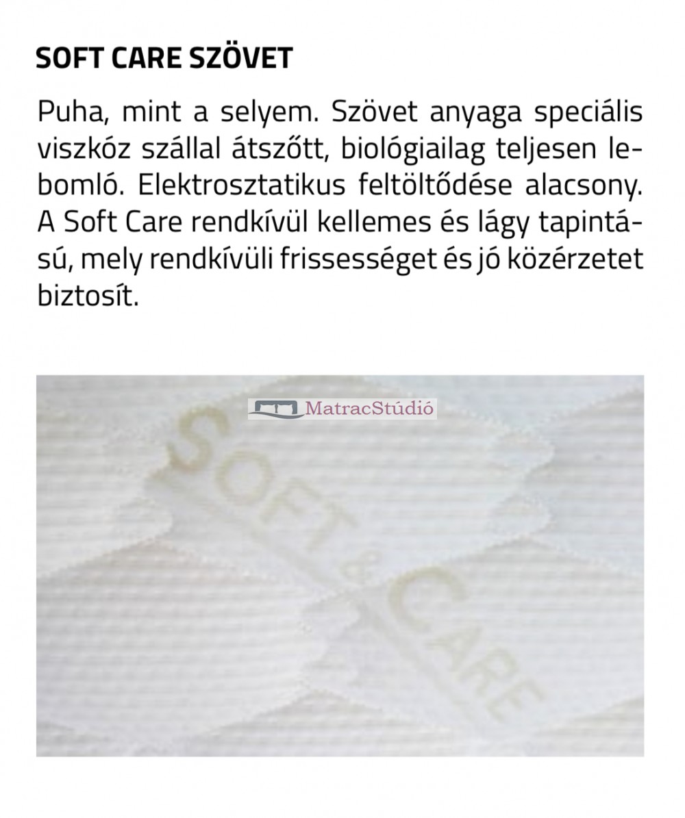 Puha, akár a selyem. A szövet speciális viszkózszállal átszőtt, biológiailag teljesen lebomló anyagból készül, elektrosztatikus feltöltődése rendkívül alacsony. A Soft Care huzat rendkívül kellemes, lágy tapintású, frissességet és jó közérzetet biztosít minden használat során.